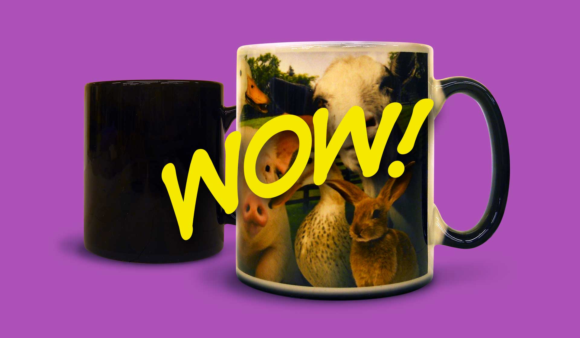 When a drink is being made and hot liquid is poured into the mug, the WOW! Coating becomes transparent and reveals whatever high-impact design and message you had in mind. (If you need any suggestions, our highly experienced creative people are full of great ideas!) As the printed mug cools, the coating reverts to its original state – waiting for the next drink to be made.